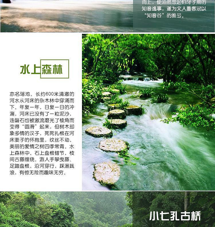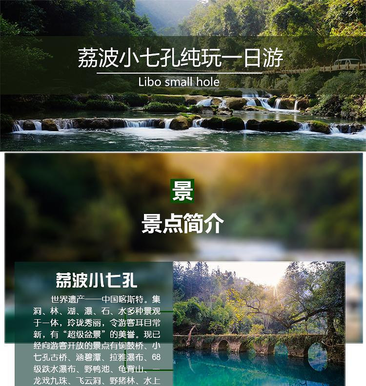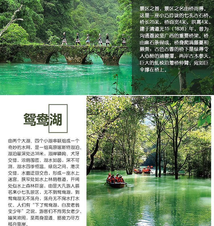 小七孔在宽仅1公里、长12公里的狭长幽谷里,集洞、林、湖、瀑、石、水多种景观于一体,景外有景,景中有洞,洞中有景;林中有水,水中有林。这里富含负氧离子,是旅游界公认的一个“洗眼、洗心、洗肺”的好地方!主要景点有:「卧龙潭」、「鸳鸯湖」、「翠谷瀑布」、「水上森林」、「六十八级跌水瀑布」、「拉雅瀑布」、距今175年的「小七孔古桥」以及通往广西的「铜鼓桥」。